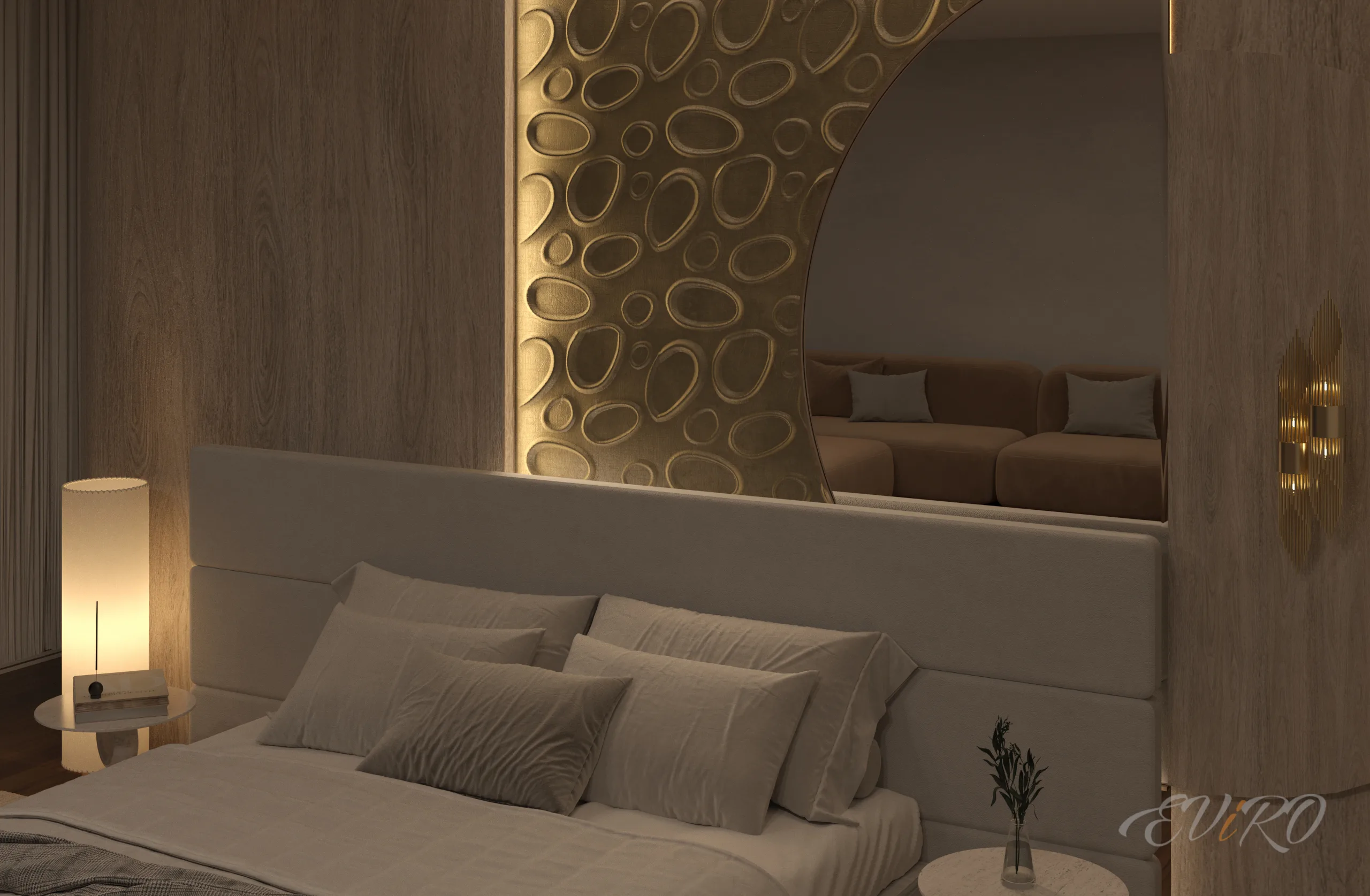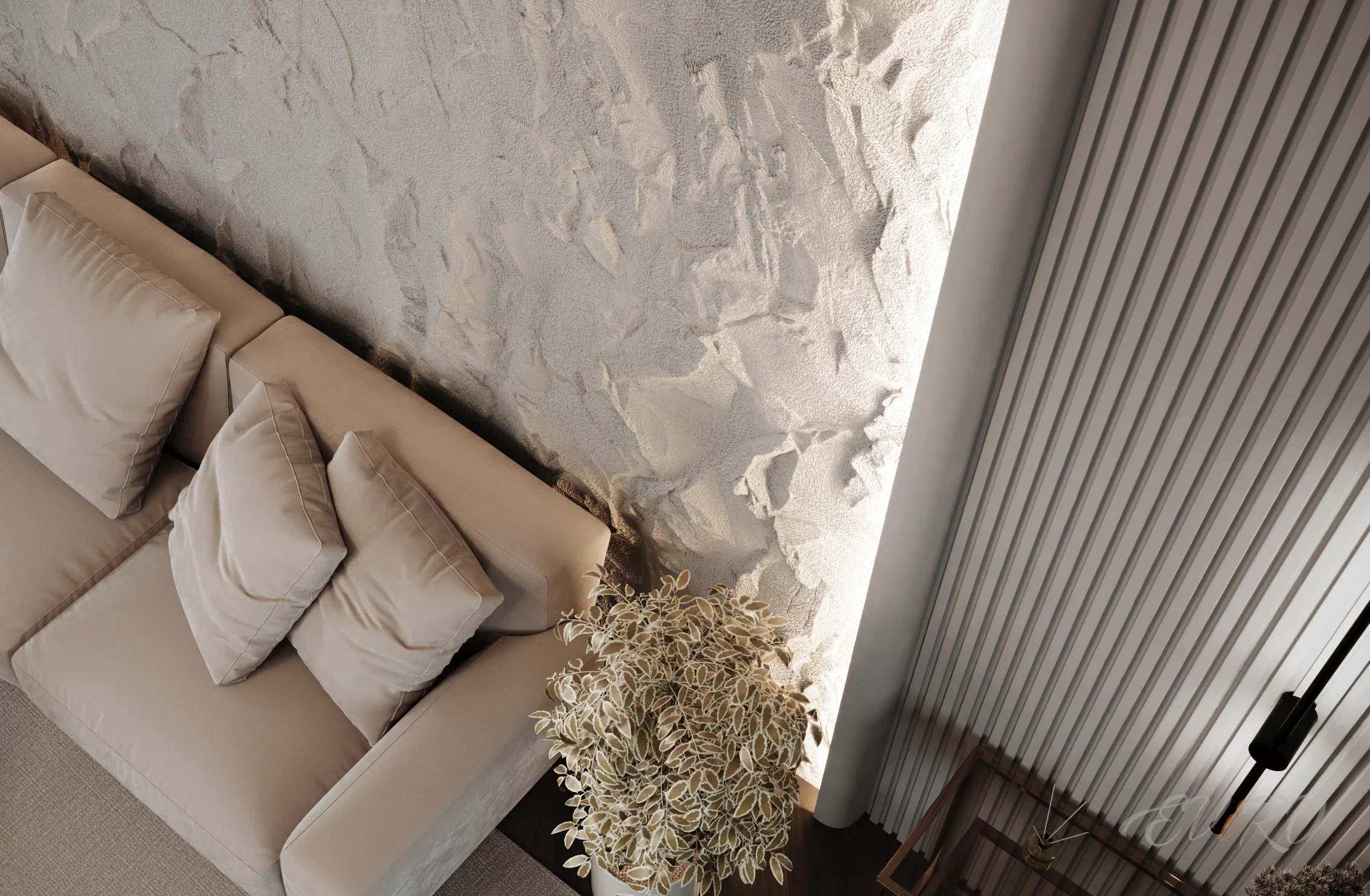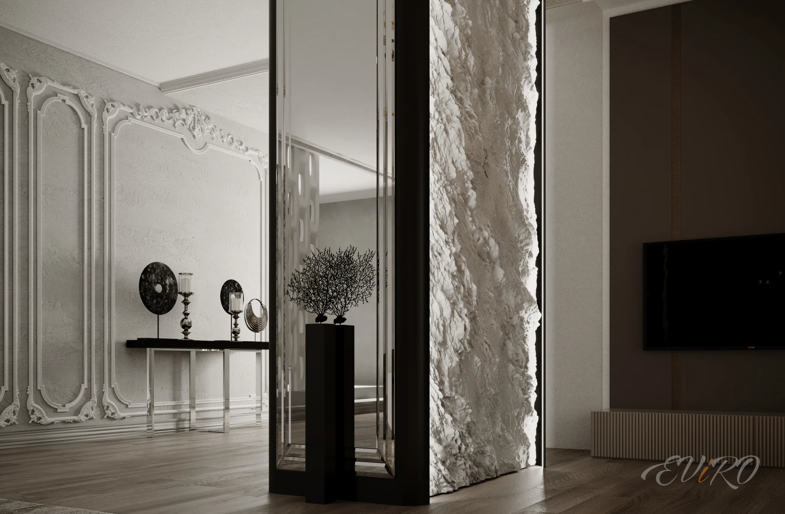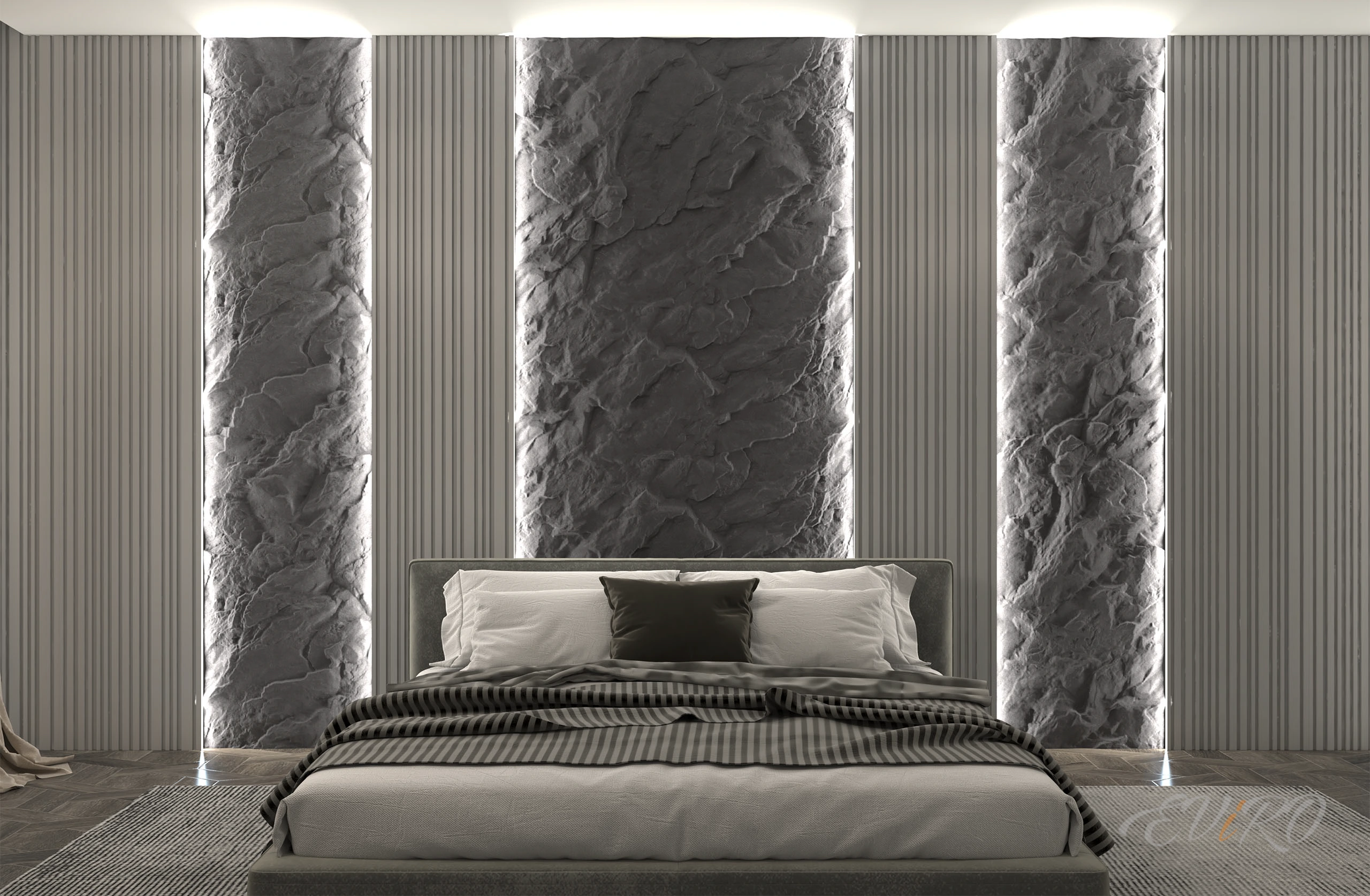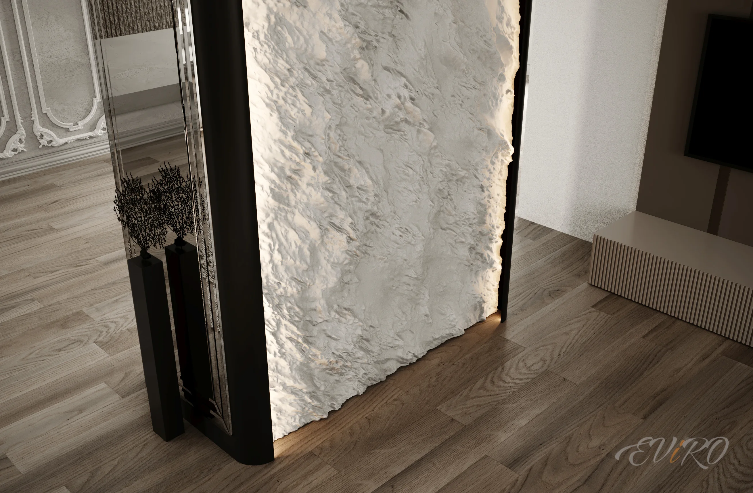 Использование гипсовых угловых профилей EViRO для подсветки декоративных рельефных панелей из гипса позволяет создать современный и необычный интерьер. Игра света и тени на стеновых 3d панелях создает неповторимую атмосферу уюта и комфорта.
