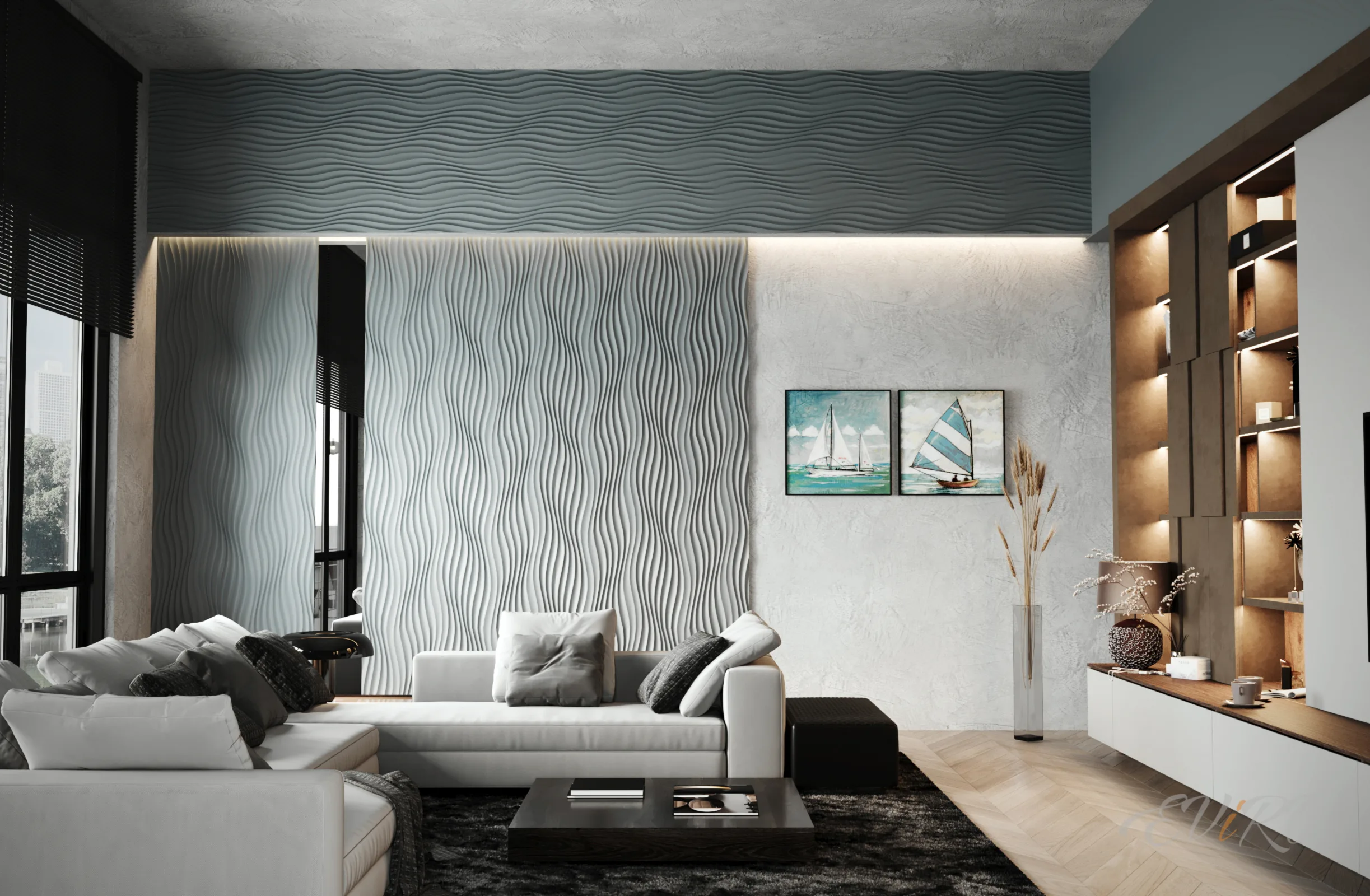Вариант 7. Дизайнерские 3D панели рейки с подсветкой гостиной