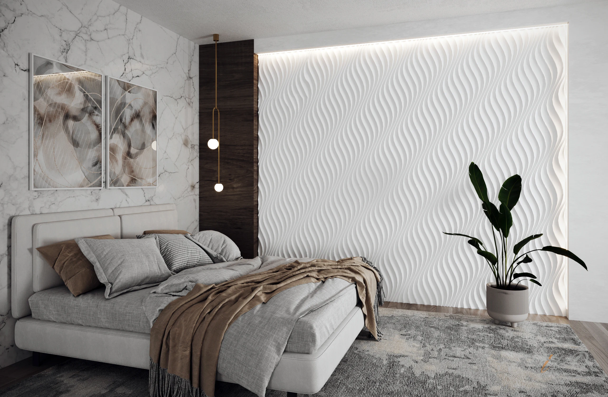 Гипсовые 3d панели для отделки стен уже стали символом современной отделки стен во всем мире. Их рельефная структура придает помещению особый шарм, делая его более живым, за счет интересной игры теней. Для того чтобы декоративные 3d панели отрабатывали себя на все 100%, нужна подсветка зоны панелей на рельеф. Если раньше для достижения подобного эффекта приходилось использовать сложные конструкции из гипсокартона, то на сегодняшний день найден более простой и быстрый способ подсветки рельефных панелей - угловые профили подсветки ниш EViRO под покраску. Это гипсовая метровая деталь, с помощью которой можно подсветку по периметру, сверху или справа и слева. Для завершения конструкции потребуется лишь алюминиевый профиль с рассеивателем и светодиодная лента, и пространство наполнится мягким, рассеянным светом, подчеркивающим неповторимый рельеф 3D стеновых панелей.