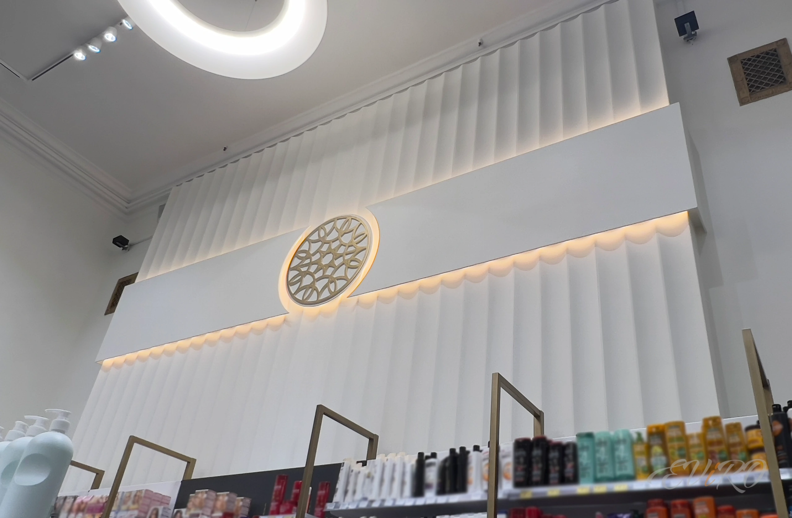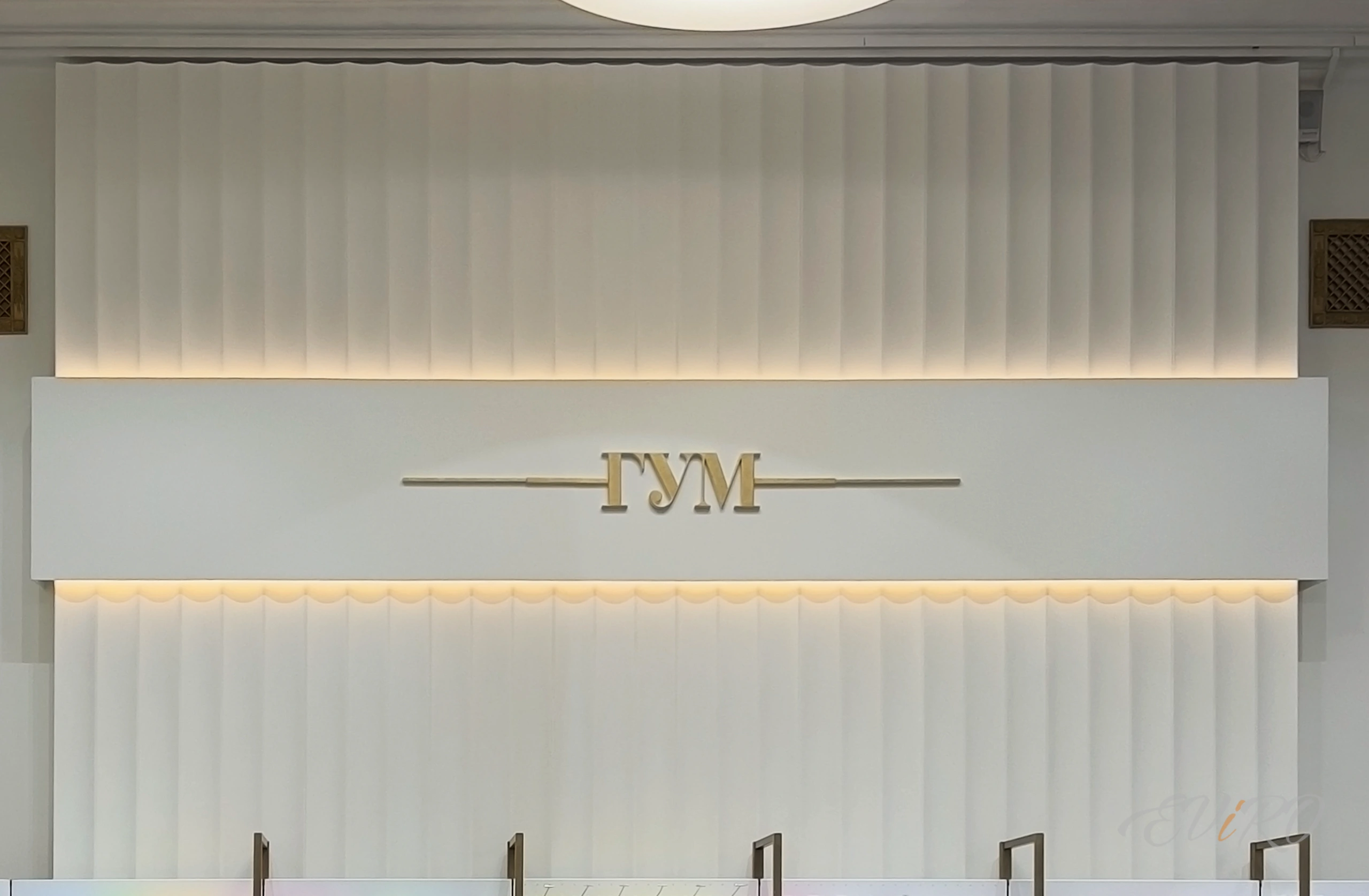ГУМ на протяжении всей своей деятельности не просто торговый объект, а магазин-новатор. Но популярность торгового центра зависит не только от качества обслуживания и уровня подготовки персонала. Важном фактором в привлечении посетителей является его интерьер. Для того, чтобы сделать торговый центр еще более современным, стильным и популярным, компанией EViRO была разработана коллекция гипсовых 3d панелей для облицовки стен «Afina». Такой отделочный материал представляет собой по-настоящему беспроигрышный вариант. Во-первых, выглядит он очень эстетично. Во-вторых, он предельно практичен. В-третьих, полностью экологичен и безопасен для здоровья человека, а это принципиально в зданиях с повышенной посещаемостью. Таким образом можно отметить, что интерьер, в котором присутствует современная отделка, привлекает покупателей, выделяет бизнес на фоне конкурентов и способствует увеличению продаж.